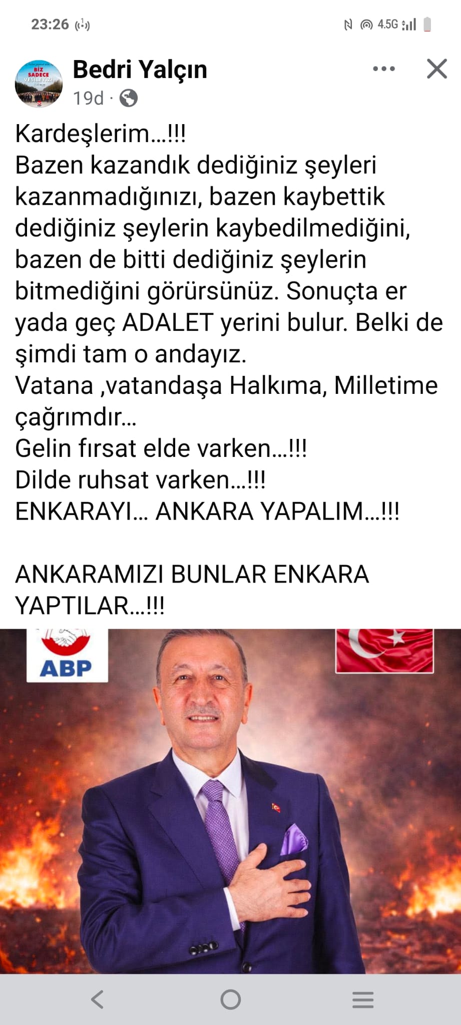 Anadolu Birliği Genel Başkanı Bedri Yalçın, yaptığı yazılı açıklamada adalet vurgusu yaparak Ankara üzerinden iktidara sert mesajlar verdi. Yalçın açıklamasında şu ifadelere yer verdi:
