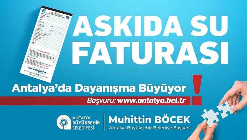Antalya Büyükşehir Belediye Başkanı Muhittin Böcek’in, dünyayı etkisi altına alan Covid-19 salgını nedeniyle ekonomik sıkıntı yaşayan vatandaşlar için geçtiğimiz yıl “Biz birlikte güçlüyüz” diyerek başlattığı “Askıda Fatura” uygulaması paylaşma ve dayanışmanın simgesi Ramazan ayında da devam ediyor. Pandemi ve tam kapanma ile birlikte su faturalarını ödemede güçlük çeken ihtiyaç sahipleri Antalya Büyükşehir Belediyesi’nin resmi internet sitesi antalya.bel.tr adresine giriş yaparak Askıda Fatura uygulamasından yararlanabiliyor.