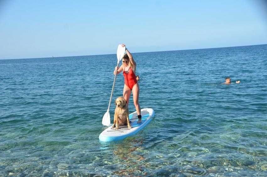 Tekila adlı köpek yüzmenin yanı sıra sörf aletine binerek turistlerle birlikte denize açılırken sevinmesi ile dikkat çekiyor. Ukrayna’dan tatile gelen güzel Katya; Tekilayı çok sevdiğini ve sevimli köpeğin kendisi ile Denizde birlikte yüzmekten mutlu olduğunu ifade etti.