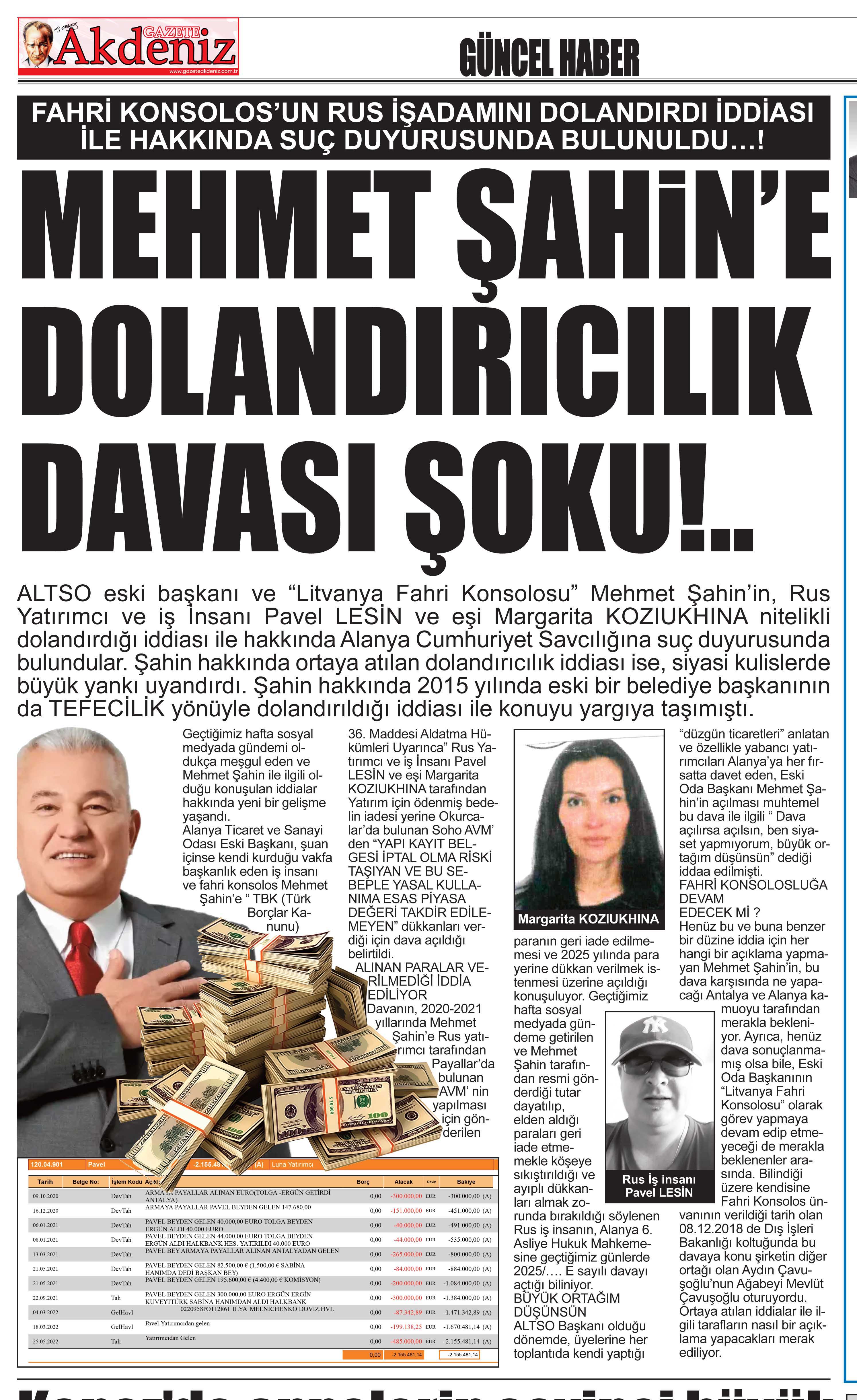 Geçtiğimiz hafta manşete taşıdığımız dolandırıcılık olayı büyüyor. ALTSO eski başkanı ve “Litvanya Fahri Konsolosu” Mehmet Şahin’in, Rus Yatırımcı ve iş İnsanı Pavel LESİN ve eşi Margarita KOZIUKHINA nitelikli dolandırdığı iddiası hakkında Alanya Cumhuriyet Savcılığına Suç duyurusunda bulunulduğu iddiası haberimiz geniş yankı uyandırdı...