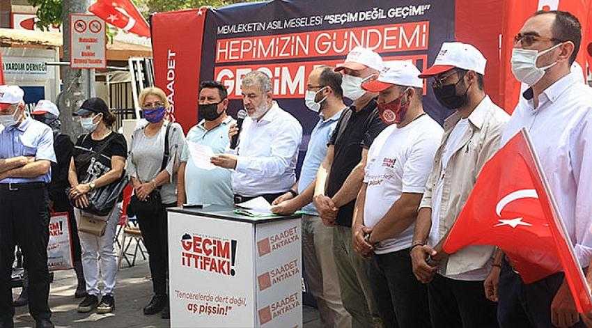 Saadet Partisi Genel Merkezi tarafından ‘Tenceremde dert değil aş pişsin’ diyen vatandaşların ‘Geçim İttifakı’ çatısı altında bir araya getirmek amacıyla başlatılan kampanya kapsamında partinin Antalya İl Başkanlığı Kapalıyol'da basın açıklaması yaptı. “İnsanların asıl gündemi geçim derdi” diyerek Geçim İttifakı kampanyasını başlatan Saadet Partisi Antalya İl Başkanı Ramazan Düzen, ülkenin içinde bulunduğu ekonomik kriz ve vatandaşın yaşadığı mağduriyetler göz önüne alınarak kurulan Geçim İttifakı’na vatandaşların da yoğun ilgi gösterdiğini belirtti. Partililer adına basın açıklamasını okuyan İl Başkanı Ramazan Düzen, "Türkiye'nin bugünkü haline bakıp da üzülen, bunalan, yorulan ve sıkılan her bir vatandaşımıza ‘Geçim İttifakı’nda bir araya gelme çağrısında bulunuyoruz" dedi.