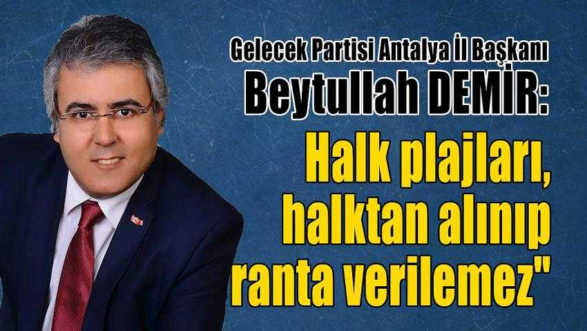Serik’teki Belek ve Kadriye plajlarında yapılmak istenen rant planlarına Gelecek Partisi Antalya İl Başkanlığı olarak müsaade etmeyeceklerini vurgulayan Başkan Demir, “Antalya halkını Kültür ve Turizm Bakanlığı’nın yaptığı rant planlarının önüne geçmeye çağırıyorum. Hep beraber mücadele edip, ranta ‘dur’ demeliyiz” dedi.