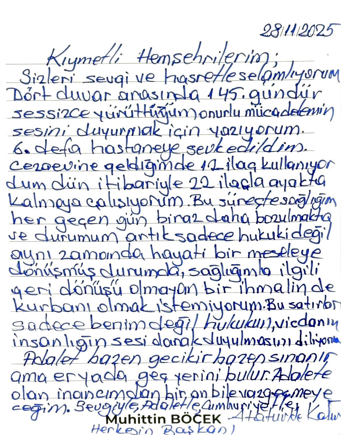 “Kıymetli hemşehrilerim, dört duvar arasında 145 gündür sürdürdüğüm onurlu mücadelemin sesini duyurmak için yazıyorum. Cezaevine geldiğimde 12 ilaç kullanıyordum, bugün 22 ilaçla ayakta durmaya çalışıyorum” ifadelerini kullandı.