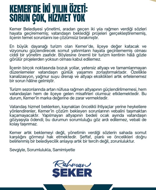 Kemer’de belediye yönetimine yönelik tepkiler büyüyor. AK Parti’nin Kemer Belediye Başkan adayı olan ve son seçimleri az bir farkla kaybeden Rahman Şeker, mevcut yönetimi sert sözlerle hedef aldı.