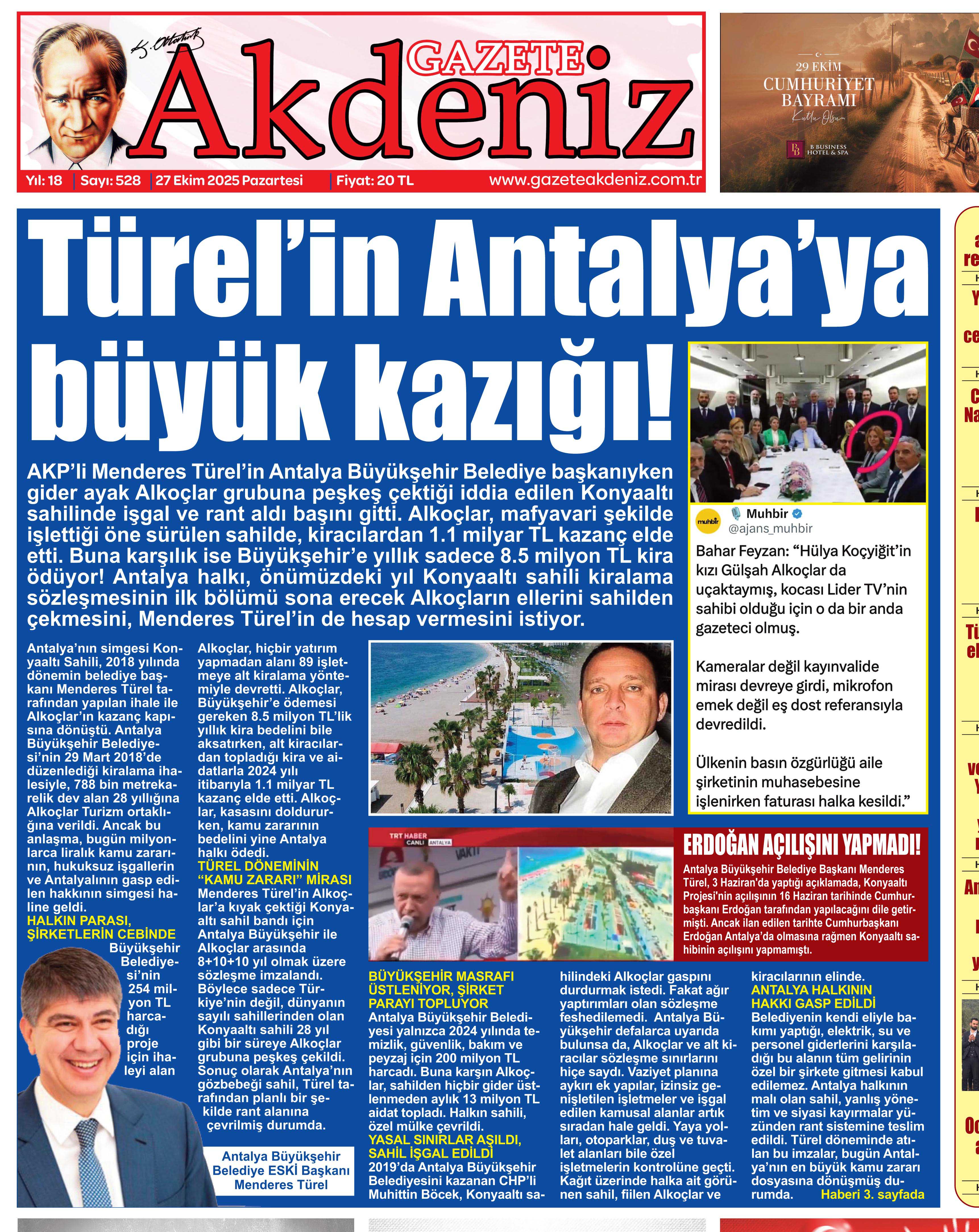 AKP’li Menderes Türel’in Antalya Büyükşehir Belediye başkanıyken gider ayak Alkoçlar grubuna peşkeş çektiği iddia edilen Konyaaltı sahilinde işgal ve rant aldı başını gitti. Alkoçlar, mafyavari şekilde işlettiği öne sürülen sahilde, kiracılardan 1.1 milyar TL kazanç elde etti. Buna karşılık ise Büyükşehir’e yıllık sadece 8.5 milyon TL kira ödüyor! Antalya halkı, önümüzdeki yıl Konyaaltı sahili kiralama sözleşmesinin ilk bölümü sona erecek Alkoçların ellerini sahilden çekmesini, Menderes Türel’in de hesap vermesini istiyor.